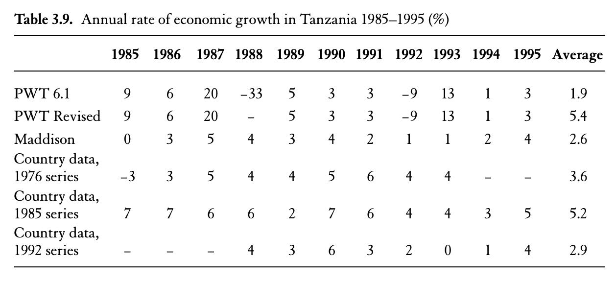 This left the question of how to reconcile the new numbers with the old ones. For somewhat murky reasons, the Penn World Tables chose to stitch the two series together in such a way to create the Late 1980s Tanzanian Growth Collapse. Not only that, but to get the reconciliation to work, the Penn data also shows a miraculous recovery over the late 1980s, with per capita growth rates averaging over 5% a year from 1995 to 1999. (This recovery has erroneously been used to tout the success of Tanzania’s structural adjustment program.)