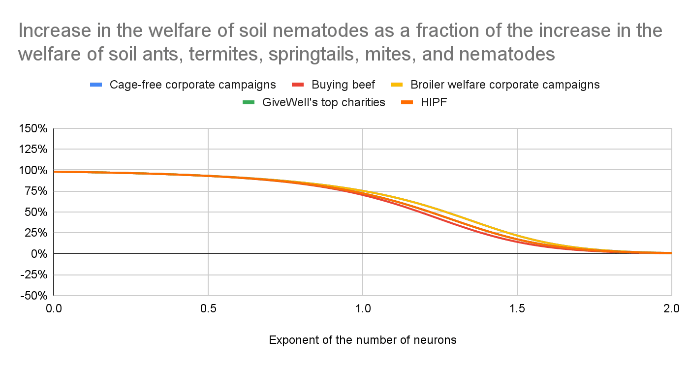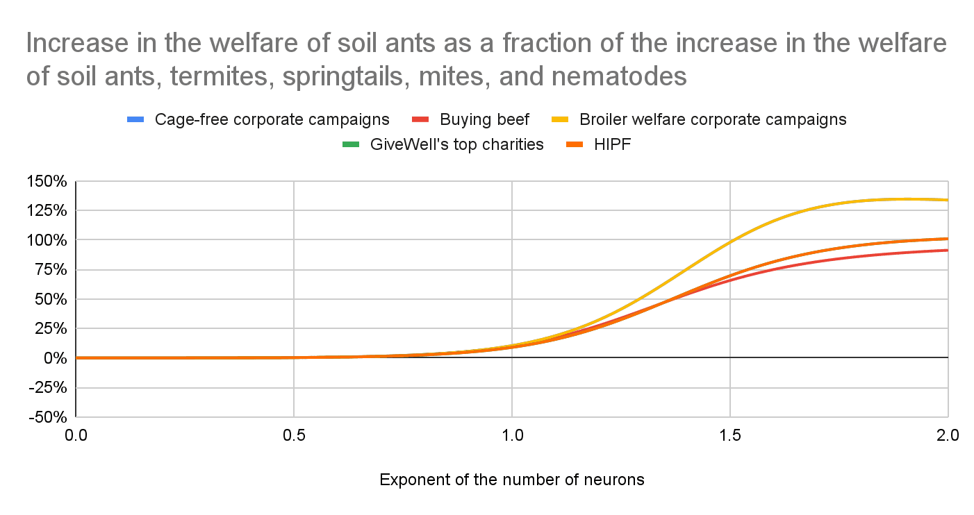 - I believe effects on soil animals are much larger than those on target beneficiaries. I am confident the exponent of the number of neurons is the parameter which affects the ratio between the effects on soil animals and target beneficiaries the most by far, and effects on soil animals dominate at least for values of the exponent up to 1, which are the ones I consider plausible. I get the following increase in the welfare of soil ants, termites, springtails, mites, and nematodes as a fraction of the increase in the welfare of the target beneficiaries. For exponents of the number of neurons of 0.19, 0.5, and 1: