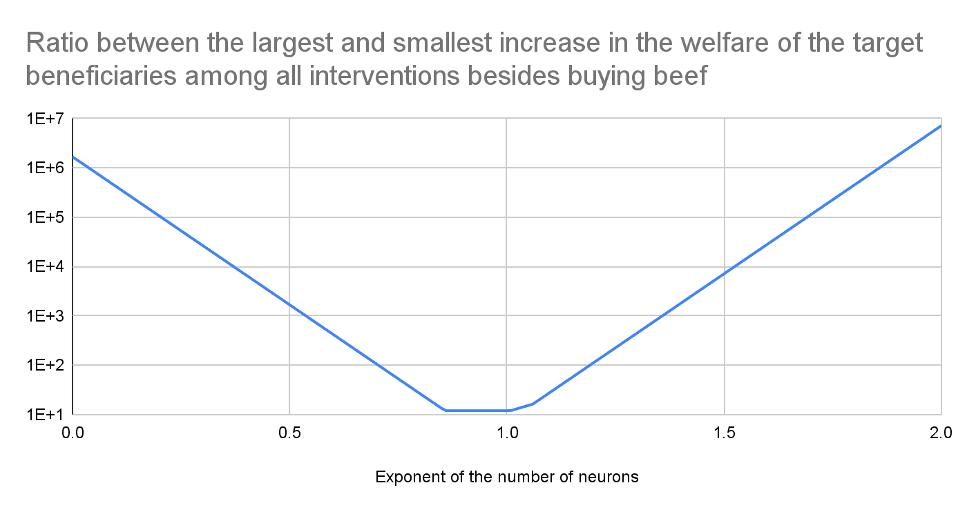 - 0.5, corresponding to my best guesses for the welfare ranges, the number of neurons has to become 100 (= 10^(1/0.5)) times as large for the welfare range to become 10 times as large.