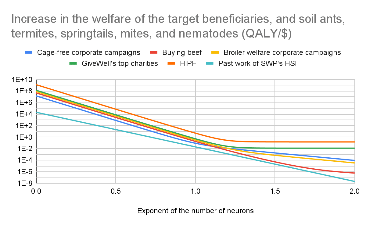 I believe effects on soil animals are much larger than those on target beneficiaries. I am confident the exponent of the number of neurons is the parameter which affects the ratio between the effects on soil animals and target beneficiaries the most by far, and effects on soil animals dominate at least for values of the exponent up to 1, which are the ones I consider plausible. I get the following increase in the welfare of soil ants, termites, springtails, mites, and nematodes as a fraction of the increase in the welfare of the target beneficiaries. For exponents of the number of neurons of 0.19, 0.5, and 1: