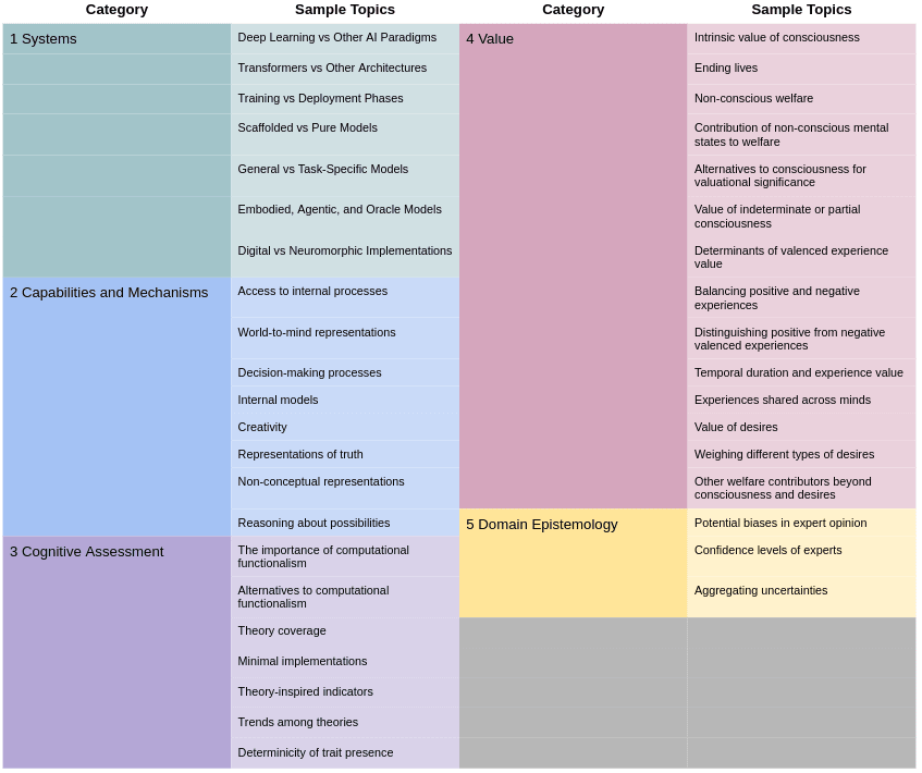 Our team is currently working on a model of the probabilities of consciousness in contemporary AI systems that touches on a variety of the questions posed here. We plan to release research related to the issues raised by that project as we go. We're interested in other projects related to the questions below, and we have some specific ideas about what we'd like to work on, but this is a fast-moving space and so we would recommend that prospective donors reach out directly to discuss what might make the most sense for us to focus on.