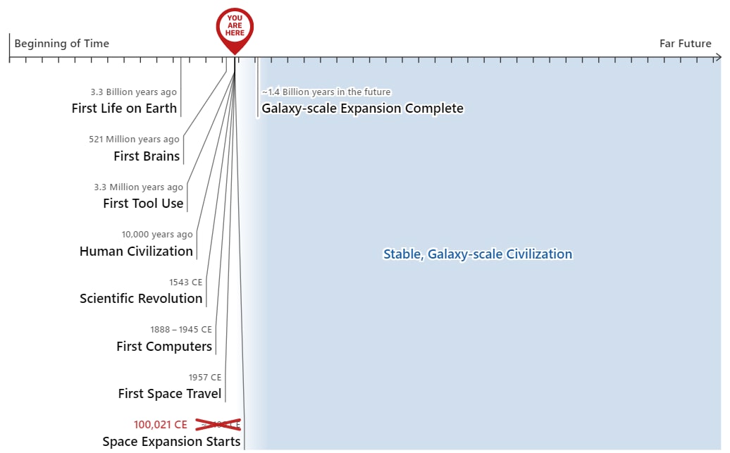 Grazie a Ludwig Schubert per il diagramma. Molte date sono altamente approssimative, dipendono da un giudizio personale e/o sono semplicemente prese da Wikipedia (fonti qui), ma le differenze plausibili non cambierebbero il quadro generale. La stima di 1,4 miliardi di anni per completare l'espansione spaziale (“Galaxy-scale expansion complete” nel diagramma) è ottenuta dividendo la distanza dei limiti estremi della Via Lattea per la velocità della più rapida sonda spaziale esistente (i dettagli sono dettagli nel foglio di calcolo più sopra). Secondo me questa è probabilmente una grossa sovrastima del tempo che servirebbe per espanderci attraverso la galassia. Vedi la nota a piè di pagina su perché non ho usato un asse logaritmico.[4]