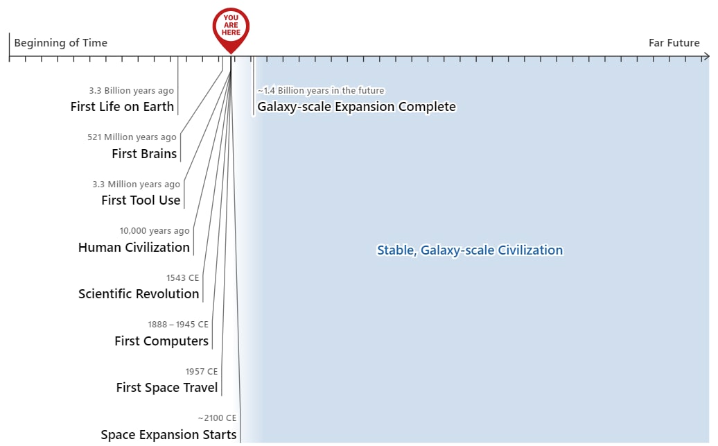 - Questo punto di vista sembra incredibile. Davanti a qualsiasi asserzione che viviamo in tempi così speciali, la reazione dovrebbe essere di pensarci due volte. Mostro questo rappresentando la storia della nostra galassia con una linea del tempo. (A livello personale, questa incredulità è probabilmente la ragione principale per cui, per molti anni, sono rimasto scettico sui ragionamenti di questo tipo. Asserzioni tali sull’importanza dei tempi in cui viviamo sembrano così incredibili da suscitare sospetti).