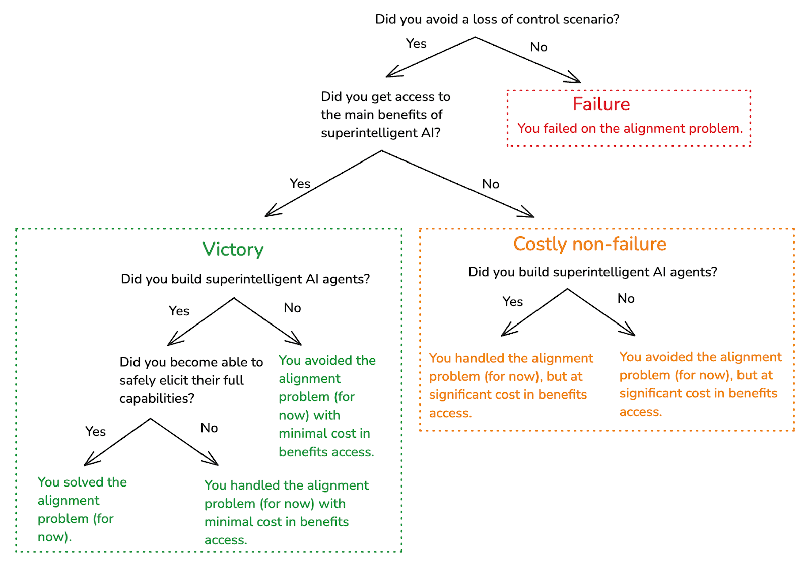 Solving the problem implies victory, in my sense (I’ll treat safe elicitation as a form of “access”). But avoiding and handling the problem are compatible with both victory and costly non-failure.