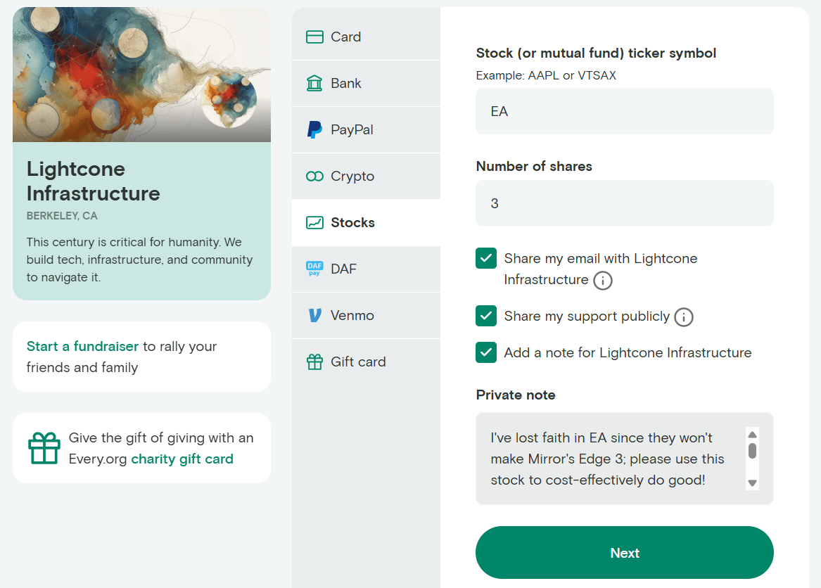 Donating my shares to Lightcone Infrastructure, the Good Food Institute, and the Long-Term Future Fund, because EA refuses to make Mirror's Edge 3.