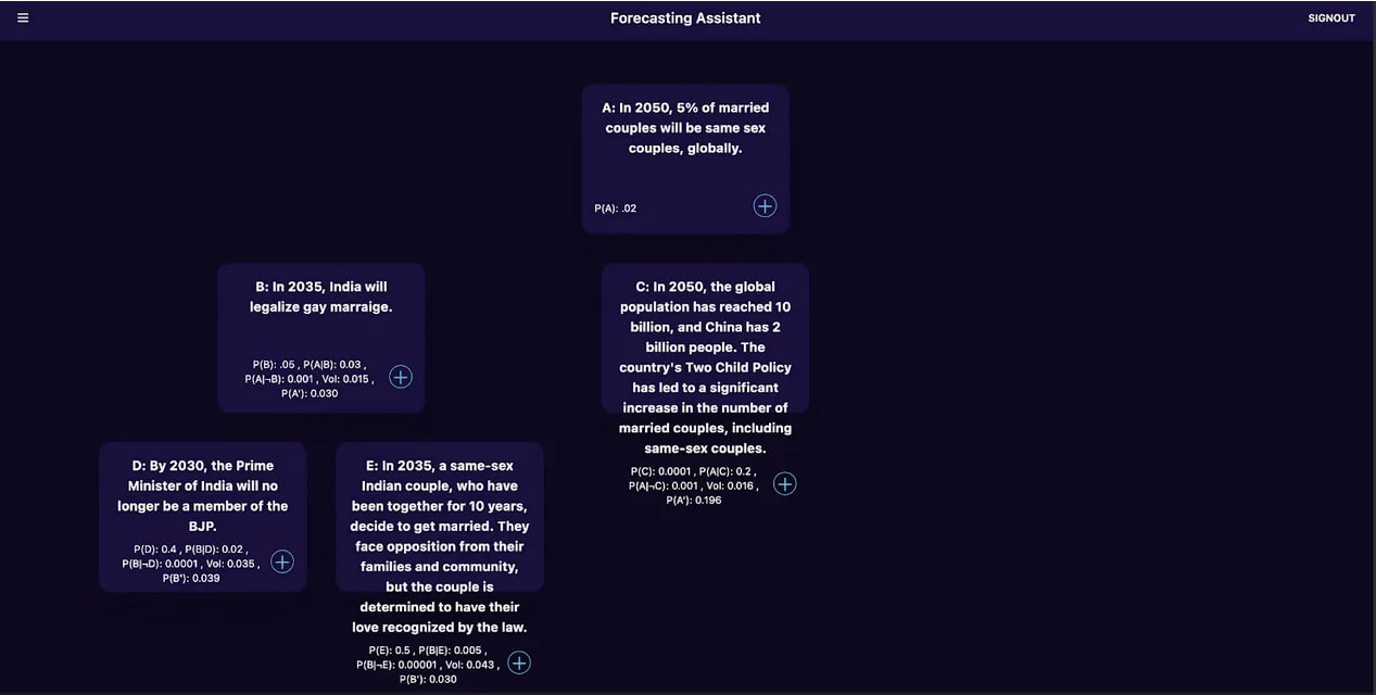 We test-drove the idea of trees for thinking better at Manifest 2023, a session called "Good Questions Tournament." Given a hard question like In 2050, what percentage of married couples will be same-sex couples, globally?, half the room generated intermediate/crux questions and half the room judged the questions by forecasting (we took the mutual information as described above). We had also finetuned GPT-3.5 to generate good crux questions to see how well these human assistants performed relative to the finetuned model. People judged each other's cruxes and the model-generated cruxes (without knowing which were which) and on average, the model's cruxes were judged more informative. Of course, this was a very small tournament! We would be very curious to see whether this holds up in more rigorous experiments.