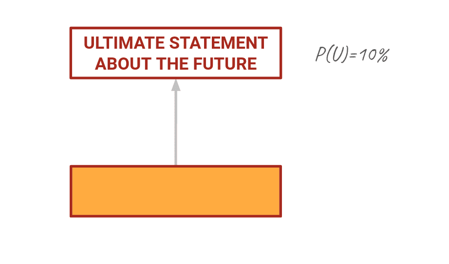 Let's say I'm an expert and I have information you want about an ultimate statement U. Initially I might say P(U) is like 10%, but I haven't thought about it very much yet. Orange box here, let's call him O, is something related to U that if I knew it was true would change my belief about U.