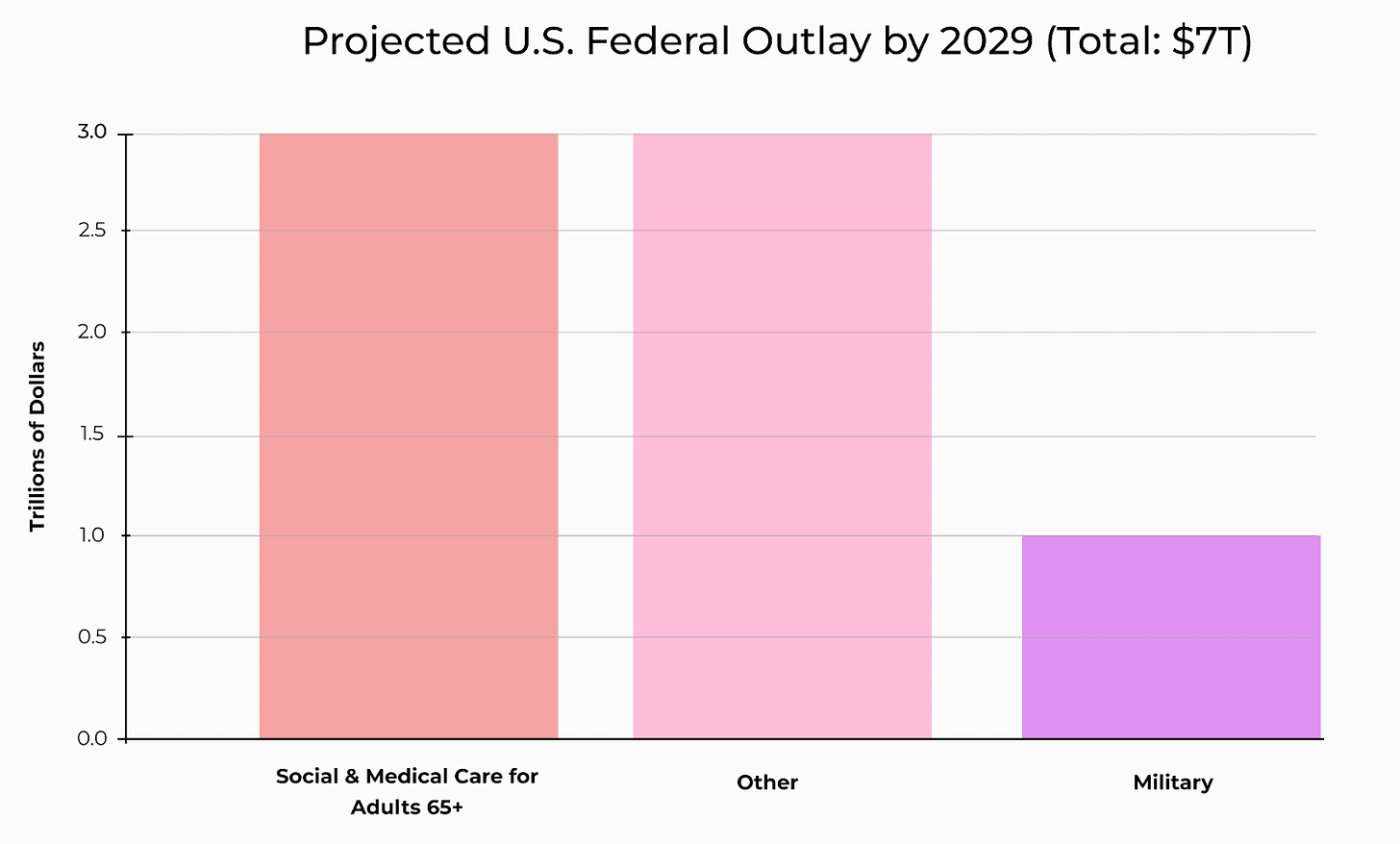 In just 11 years — between 2018 and 2029 — the U.S. mandatory spending on Social Security and Medicare will more than double, from $1.3 trillion to $2.7 trillion per year.