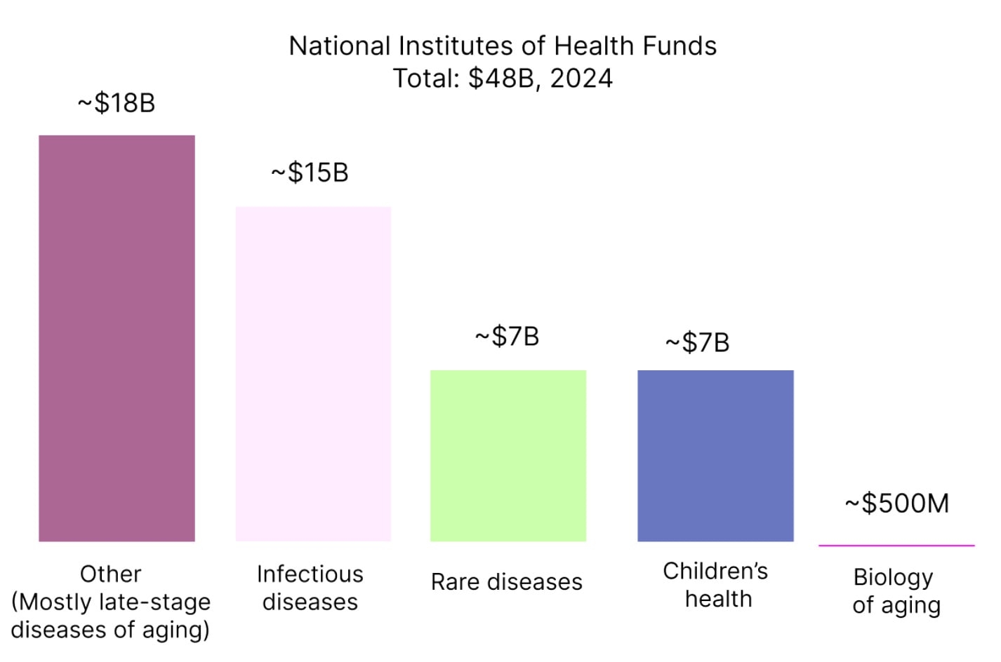 Of course, to the extent that your post is just arguing "governments should fund this area more, it seems obviously under-resourced", then that's a pretty low bar, and your graph of the NIH's painfully skewed funding priorities basically makes the entire argument for you. (Although I note that the graph seems incorrect?? Shouldn't $500M be much larger than one row of pixels?? Compare to the nearby "$7B" figures; the $500M should of course be 1/14th as tall...) For this purpose, it's fine IMO to argue "aging is objectively very important, it doesn't even matter how non-tractable it is, SURELY we ought to be spending more than $500m/year on this, at the very least we should be spending more than we do on Alzheimers which we also don't understand but is an objectively smaller problem."