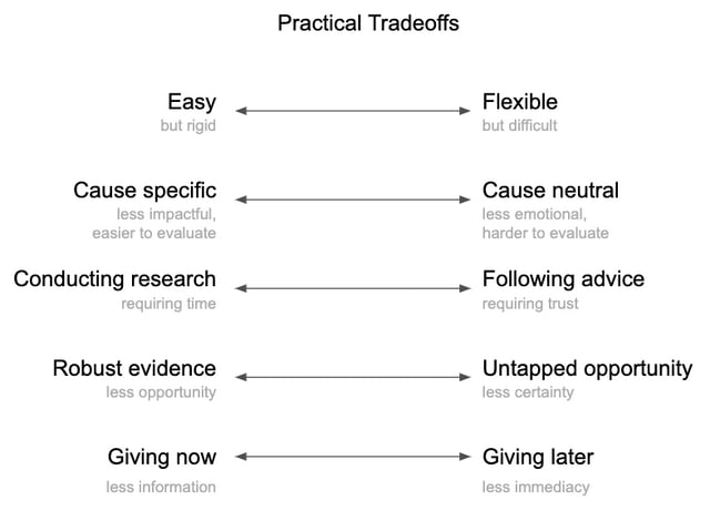 I'm working on some training materials for an EA course I teach and articles for Giving What We Can and started trying to visualise the idea of tradeoffs and priorities when it comes to choosing where to dedicate resources. These are both practical (e.g. ease, risk preference) and moral (e.g. future-focus, human-focus).