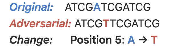 - Attack Success: 20–50% of target sequences fooled by just 2–3 nucleotide edits .