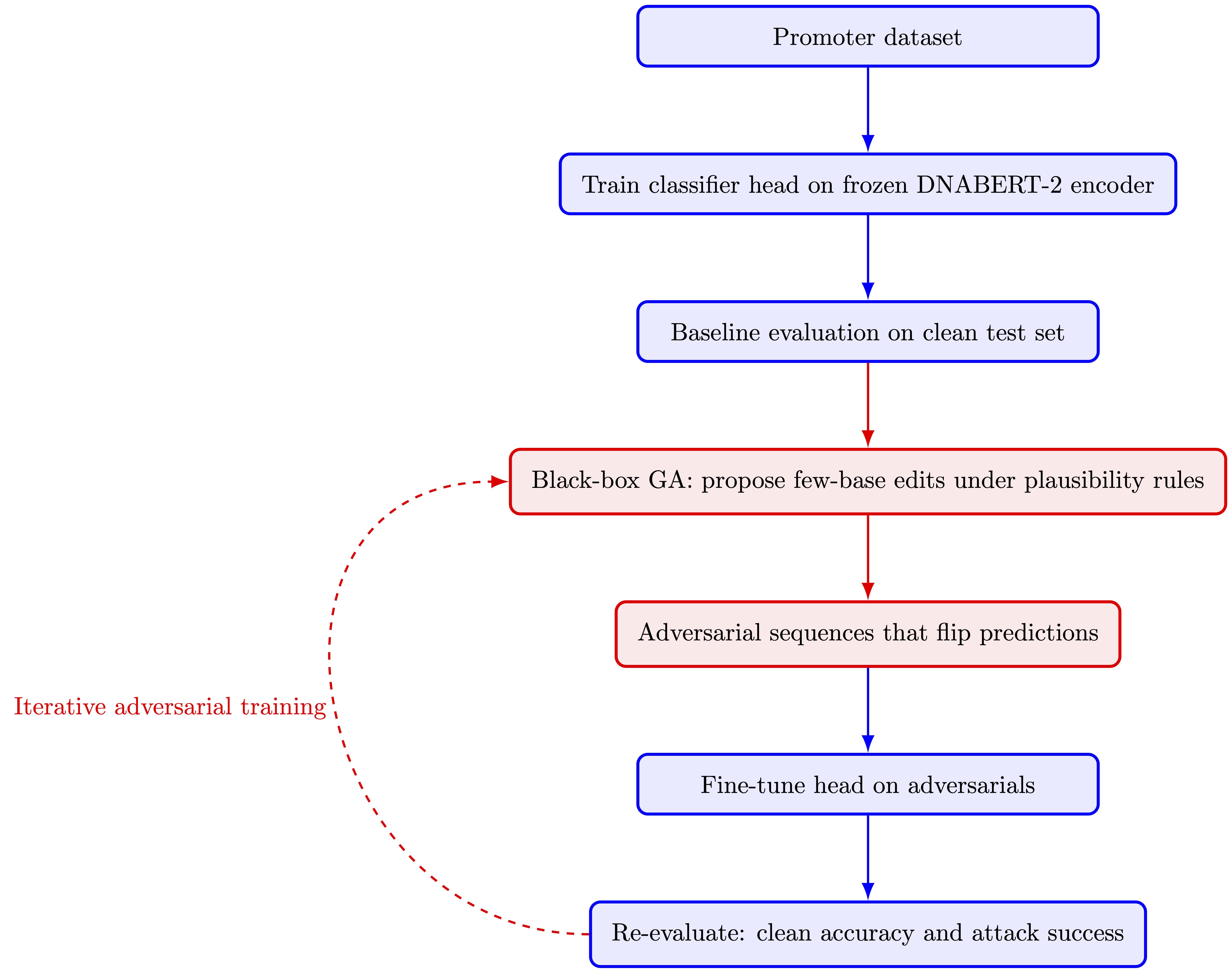 - We test a genomic foundation model (DNABERT-2 encoder with a lightweight classifier head) using a black-box genetic algorithm that proposes biologically plausible edits constrained by GC balance, motif preservation, and transition bias.