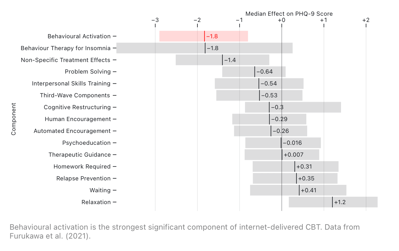 Furukawa, Toshi A. et al. (2021) Dismantling, optimising, and personalising internet cognitive behavioural therapy for depression: a systematic review and component network meta-analysis using individual participant data, The Lancet Psychiatry, vol. 8, pp. 500–511. ↩︎ ↩︎ ↩︎ ↩︎ ↩︎ ↩︎