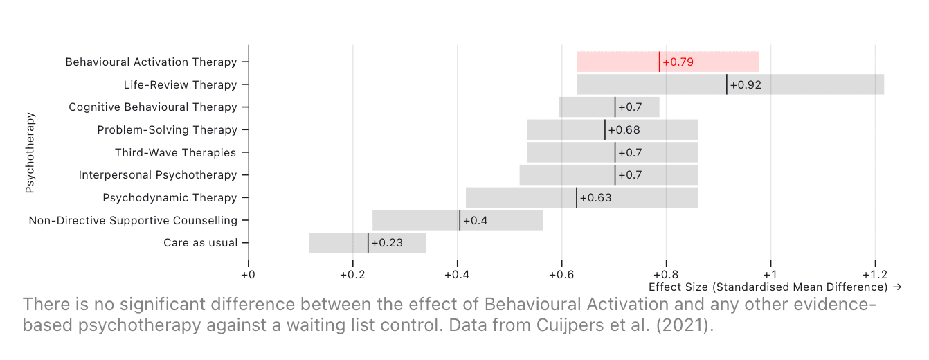 Ekers, David et al. (2014) Behavioural Activation for Depression; An Update of Meta-Analysis of Effectiveness and Sub Group Analysis, PLoS ONE, vol. 9, p. e100100. ↩︎