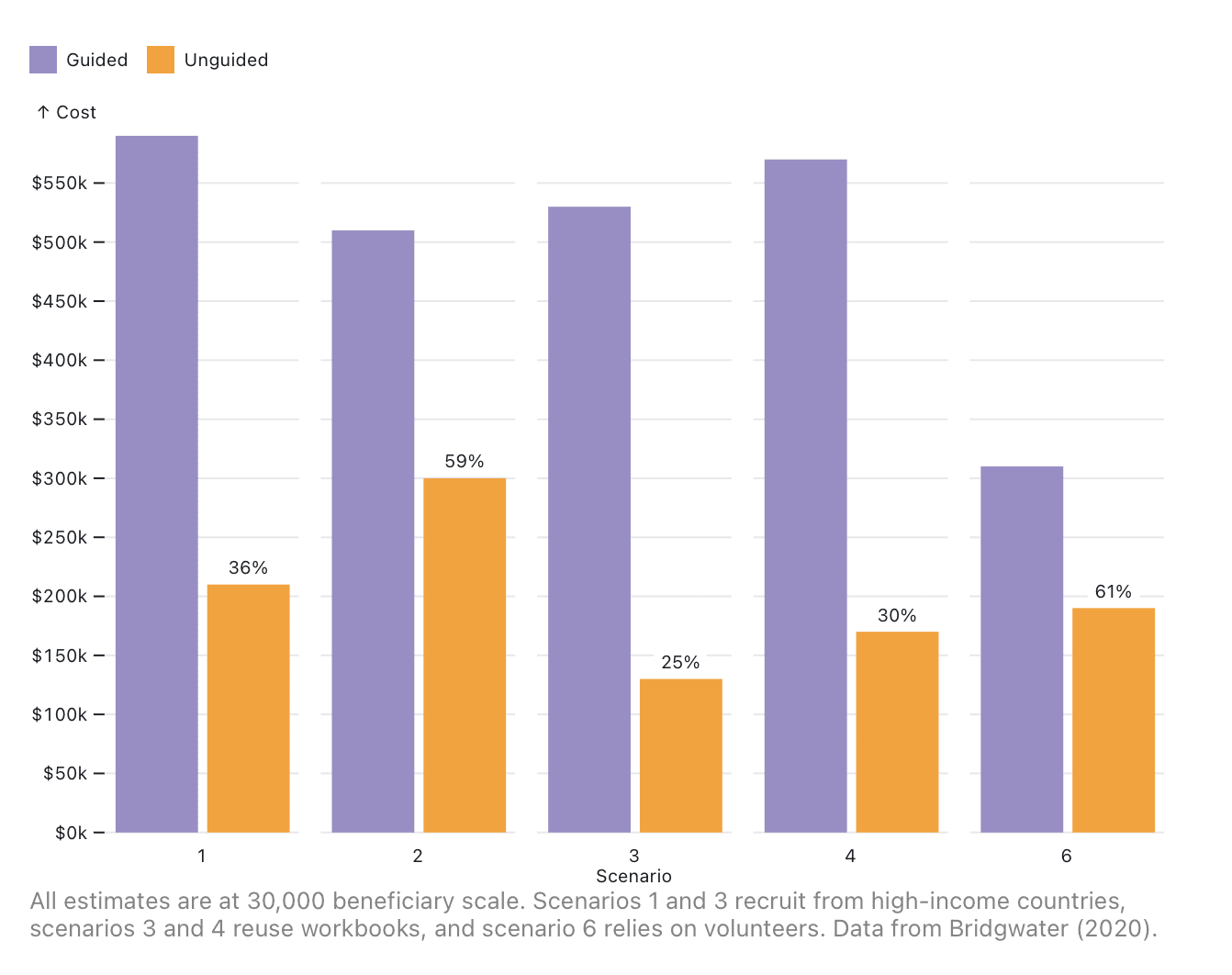 We must acknowledge that Scenario 6 uses volunteer labour, so treats staff time as free, but real-world Step-By-Step implementers believe this is unlikely to scale[5:1]. Furthermore, Scenarios 1 and 3 recruit guides from high-income countries, which would inflate costs. Scenarios 3 and 4 use reused workbooks, which accounts for their reduced costs. Scenario 4 is the most representative of those provided.