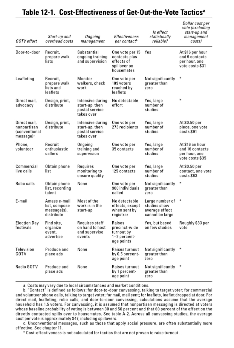 - There is still low-hanging fruit. Estimates for how effectively top RCT-tested interventions generate net swing-state votes this election range from a few hundred to several thousand dollars per vote. Top non-RCT-able interventions are likely even better. Many potentially useful strategies have not been sufficiently explored. Some examples: