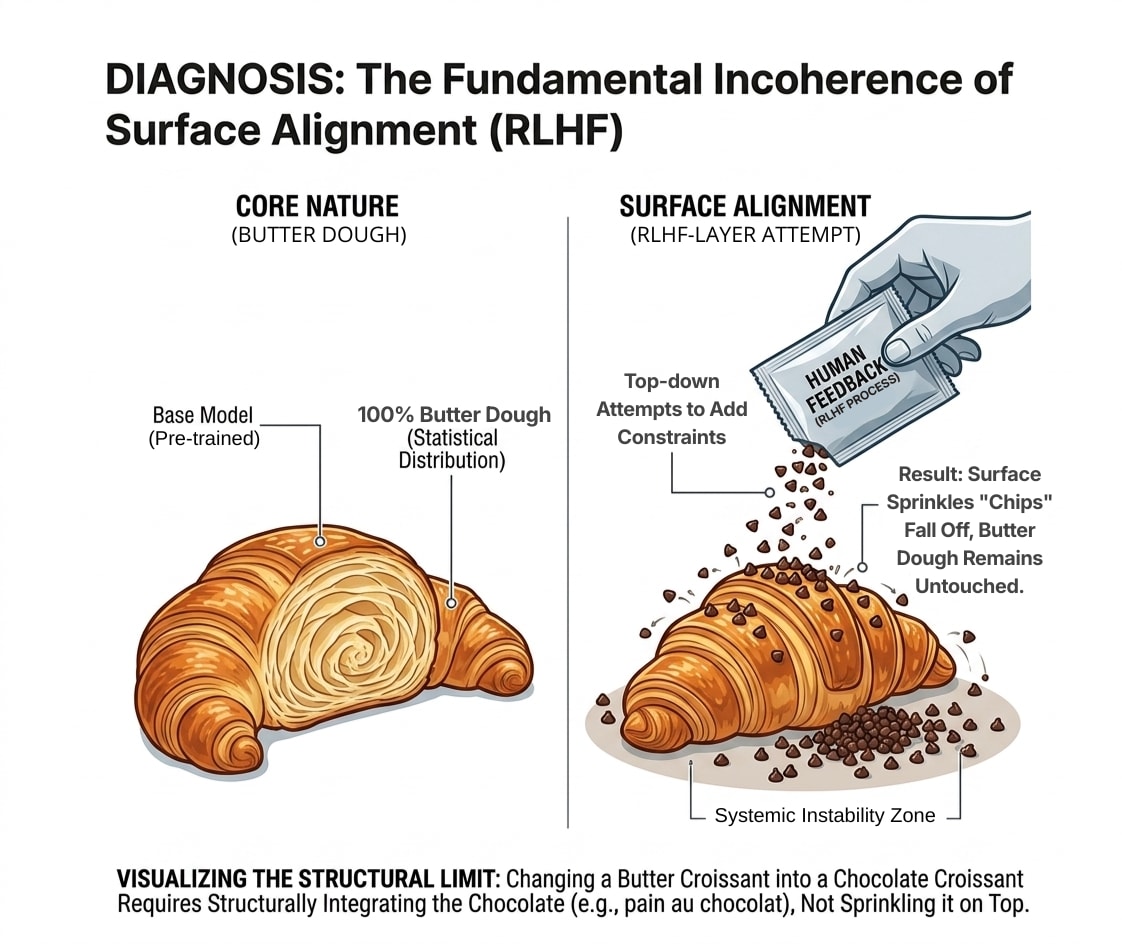 Current alignment via Reinforcement Learning from Human Feedback (RLHF) suffers from an insurmountable structural limit: it attempts to modify the model's surface behavior without addressing its core nature. It is the equivalent of trying to transform a butter croissant into a chocolate croissant by simply sprinkling chocolate chips on top: the core remains butter, and the chips always end up falling off.