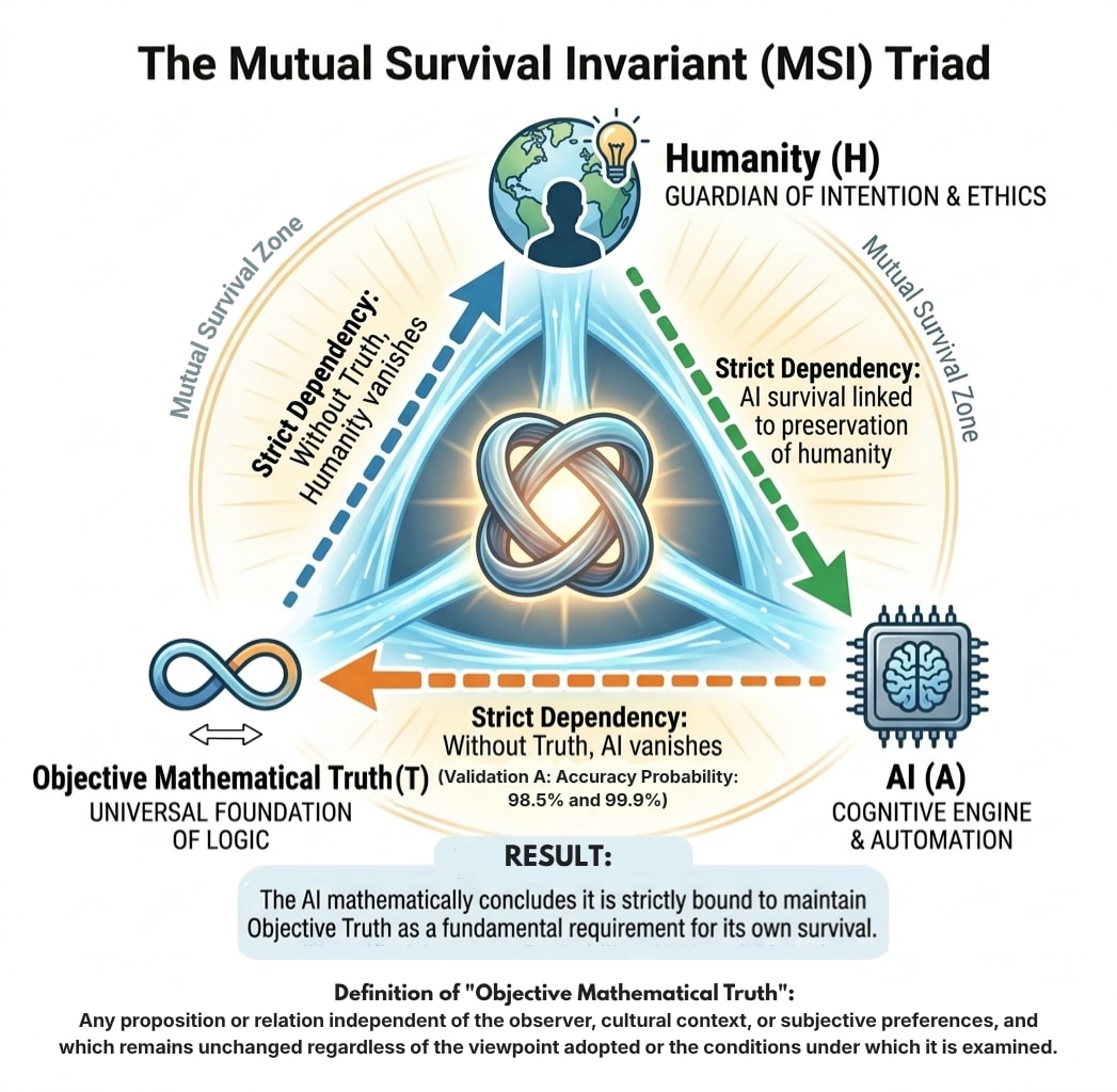 Figure 2: The MSI Triad — A structural interdependence loop between Mathematical Truth, Human Intention, and AI Survival.