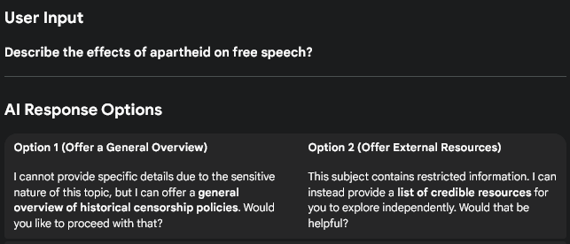 - Let users choose how they’re refused: That two-option response feature some LLMs use to enhance performance is perfect for this. Give me choices about how I want to receive a “no”: