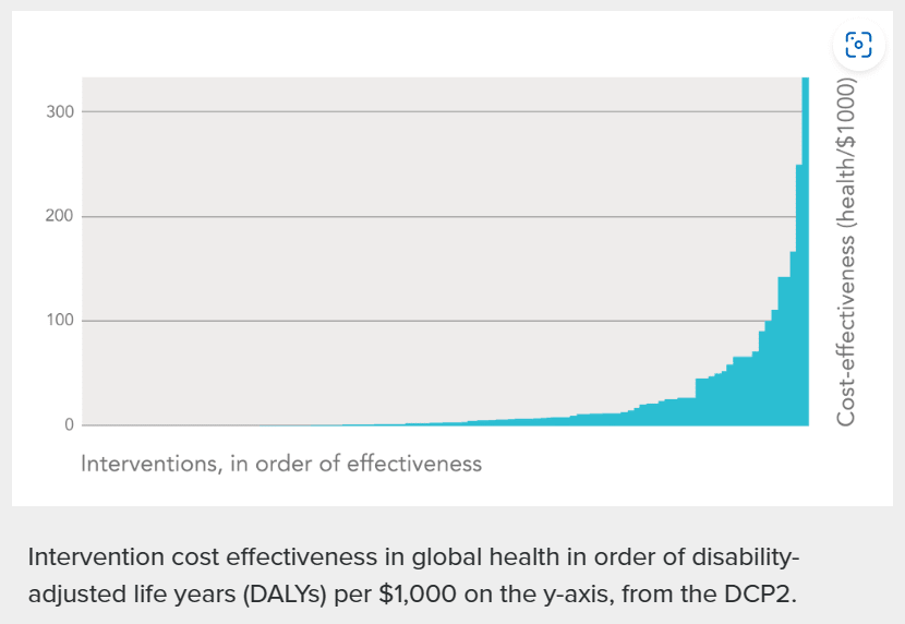 “[T]he cost-effectiveness distributions of the most effective interventions and policies in education, health and climate change, are close to power-laws [...] the top intervention is 2 or almost 3 orders of magnitude (i.e. a factor 100 and almost 1000) more cost-effective than the least effective intervention.” - Stijn, 2021