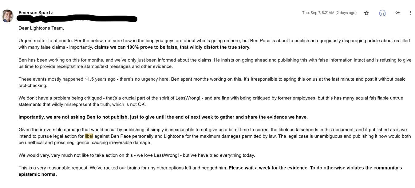 Less than a week before the publication date, Ben informed Nonlinear that he had been digging into them with intent to publish an exposé and sent them a list of concerns. Around 60 hours before publication, Ben had a three-hour phone call with the Nonlinear cofounders about those concerns in which they told him his list contained a number of exaggerations and fabrications. Nonlinear requested a week to compile and present evidence against these claimed fabrications, which Ben and Oliver rejected. The day before publication, longtime community member Spencer Greenberg obtained a draft copy of the post and warned Ben and Oliver that it contained a number of falsehoods. Ben edited some, but when Spencer sent him message records contesting one claim in the post two hours before publication, Lightcone concluded it was too late to change and that the post must release on schedule. During the few days before publication and in particular after seeing a draft copy of the post, the Nonlinear founders grew increasingly urgent and aggressive in their messages, eventually threatening to sue Lightcone for defamation if they released the post without taking another week to investigate Nonlinear's evidence. Lightcone refused.