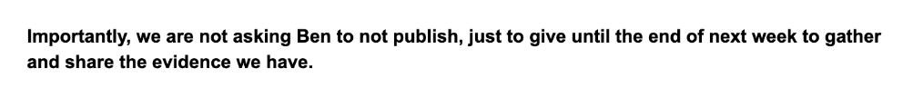 They were very clearly offering to provide specific, hard evidence in a short time span, not asking for an indefinite delay. Some of that specific, hard evidence came in two hours before publication. Ben and Oliver did not press them on the specifics, they said they had a hard deadline and that was that.
