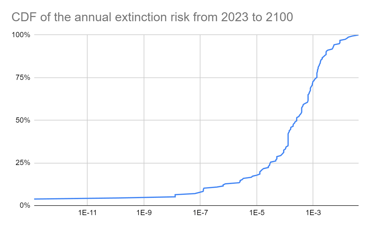 - There is great dispersion in the annual extinction risk from 2023 to 2100. Across the 4 categories[3], the ratio between the 95th percentile excluding zeros and 5th percentile excluding zeros ranges from 66.5 k to 489 k.