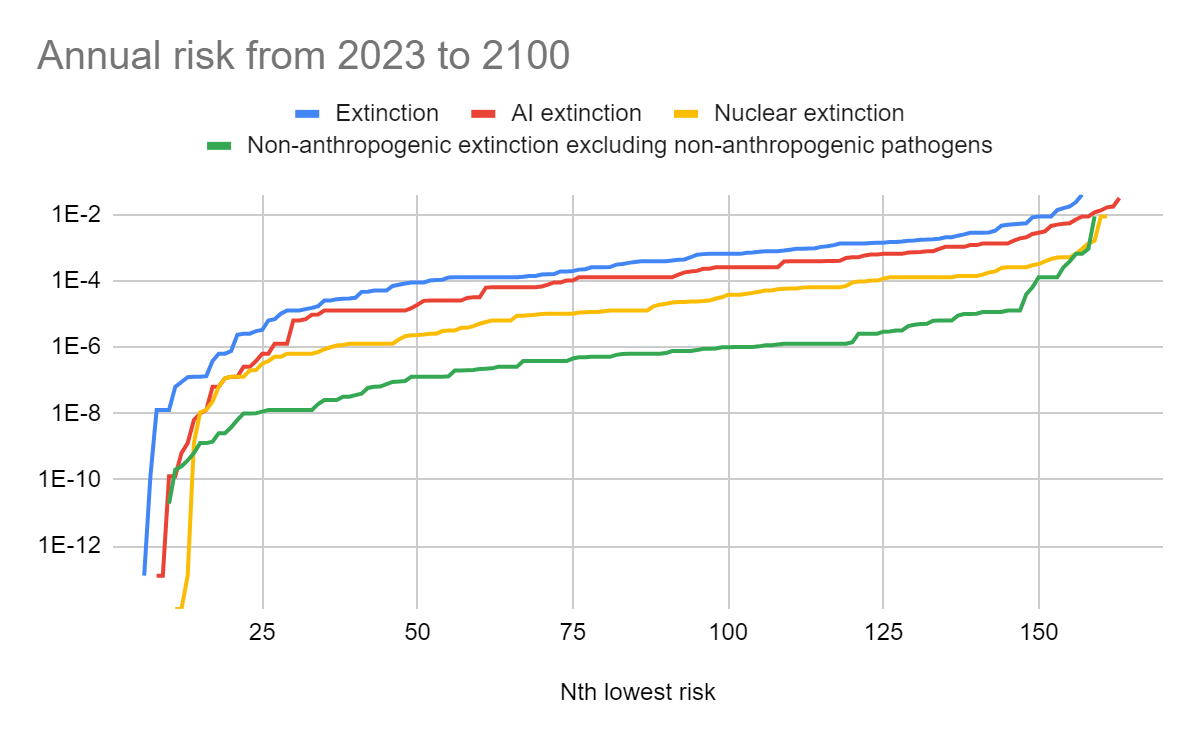 - There is great dispersion in the annual extinction risk from 2023 to 2100. Across the 4 categories[3], the ratio between the 95th percentile excluding zeros and 5th percentile excluding zeros ranges from 66.5 k to 489 k.