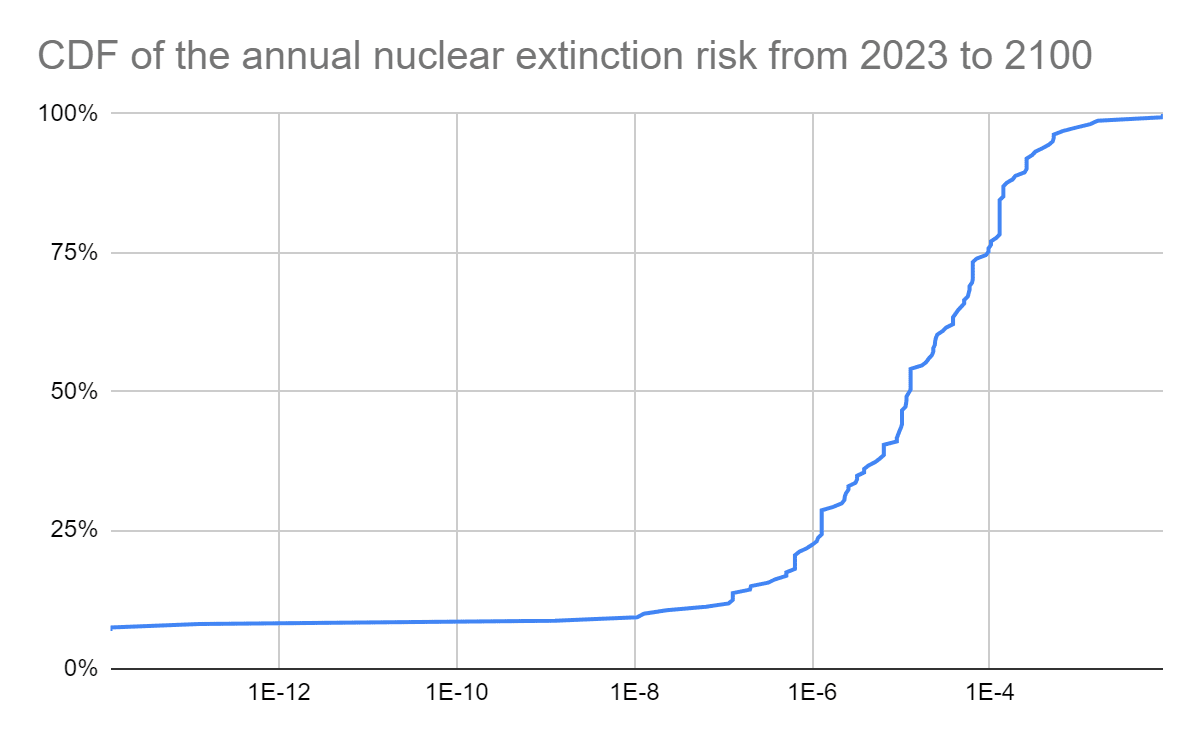 - The typical aggregates for the annual nuclear extinction risk from 2023 to 2100 range from 9.37*10^-6 to 0.0208 %, i.e. from 1.58 M (= 9.37*10^-6/(5.93*10^-12)) to 35.1 M (= 2.08*10^-4/(5.93*10^-12)) times mine of 5.93*10^-12[5]. However: