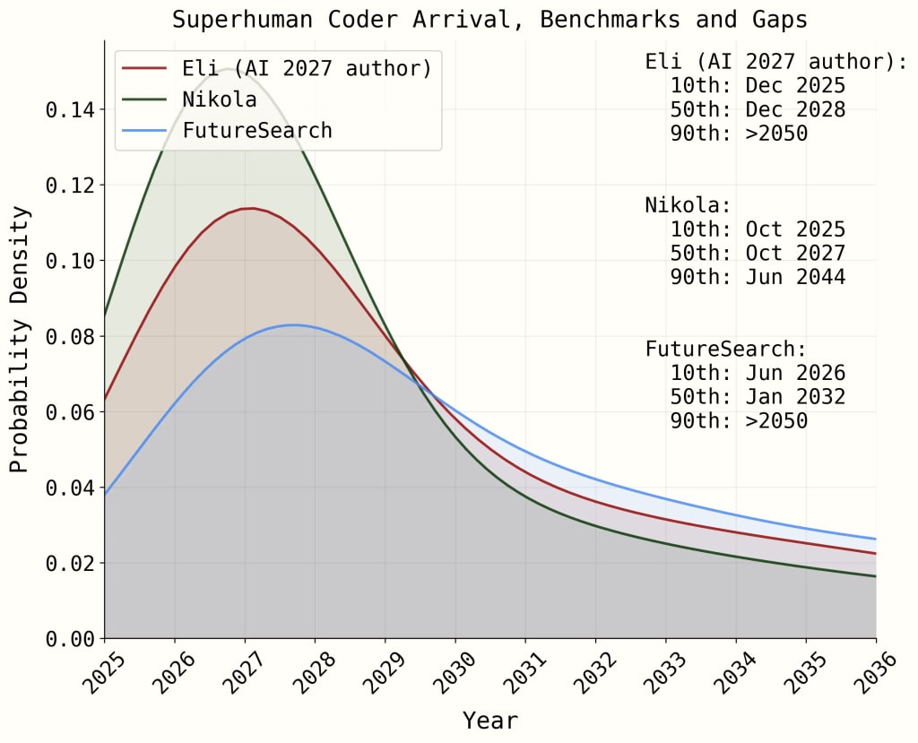 Running many simulations allows the authors to extract probability densities for the arrival date of superintelligent coders, given each forecaster’s estimates.