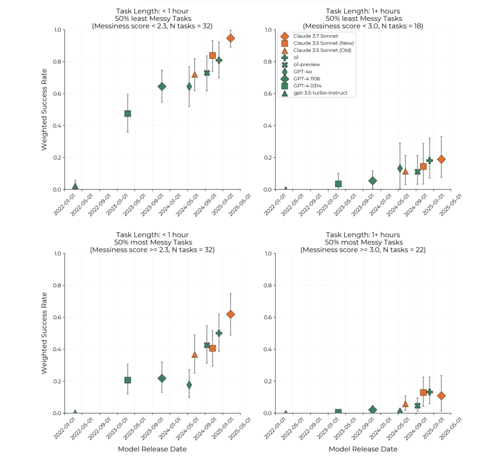 - For a task length above 1 hour, the max success rate on messy tasks is around 0.1 with o1 (Dec 2024) which was surpassed in May 2024 with GPT-4o. That makes a 7-month gap.