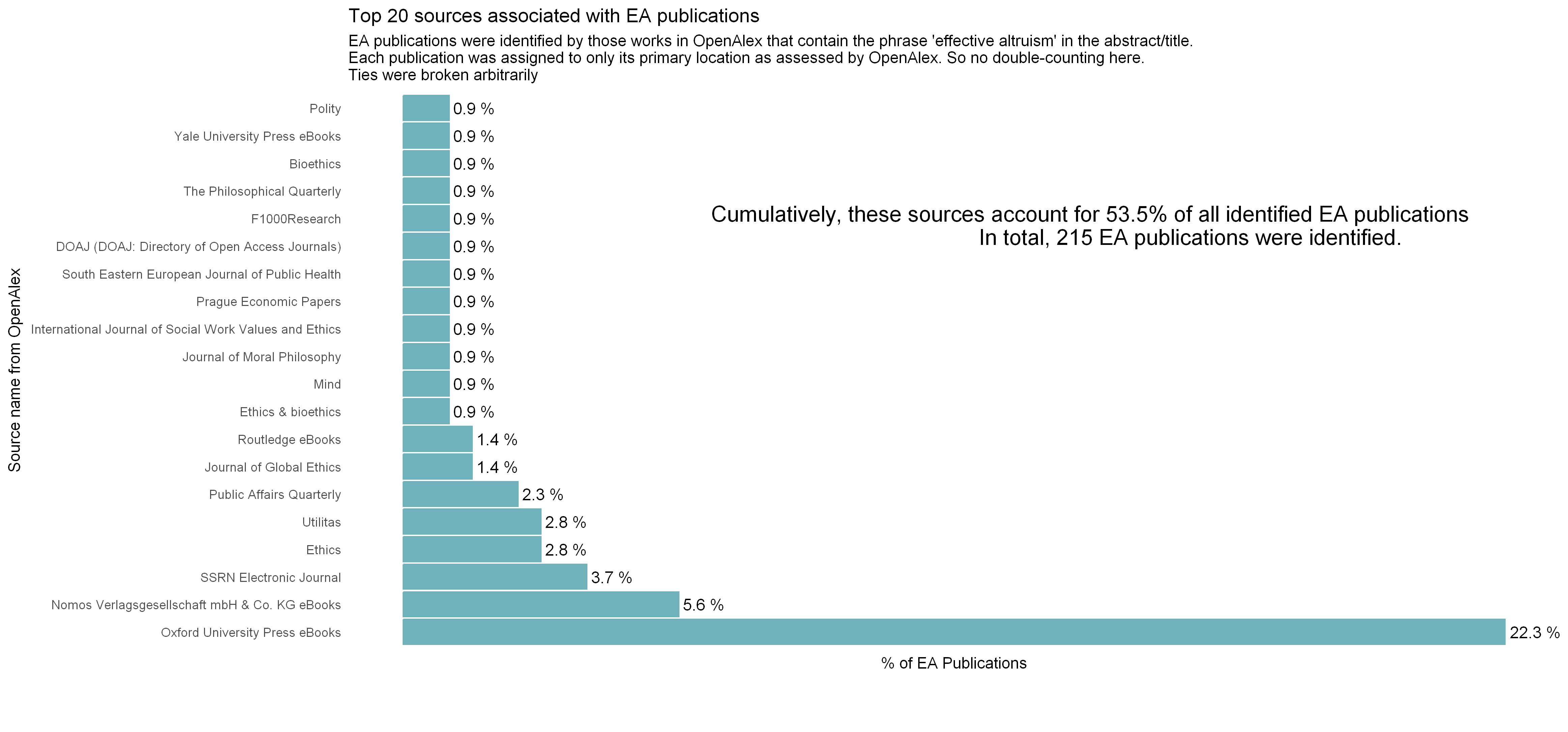 Great comment David! It made me focus in on the heart of the question here. It is simply this - What is the right counterfactual to EA, the philosophy/academic discipline? OP is comparing EA philosophy/discipline to Econ. But is that fair? When I read your comment this morning, I noticed how I utterly failed to clarify that EA is less rigorous... than what?! It got me thinking empirically and I quickly whipped up some stuff using OpenAlex which is a open-source repository of publications used by bibliometricians. Now this preliminary analysis I show doesn't resolve the question of what is counterfactual to EA, but it begins to describe the problem better.