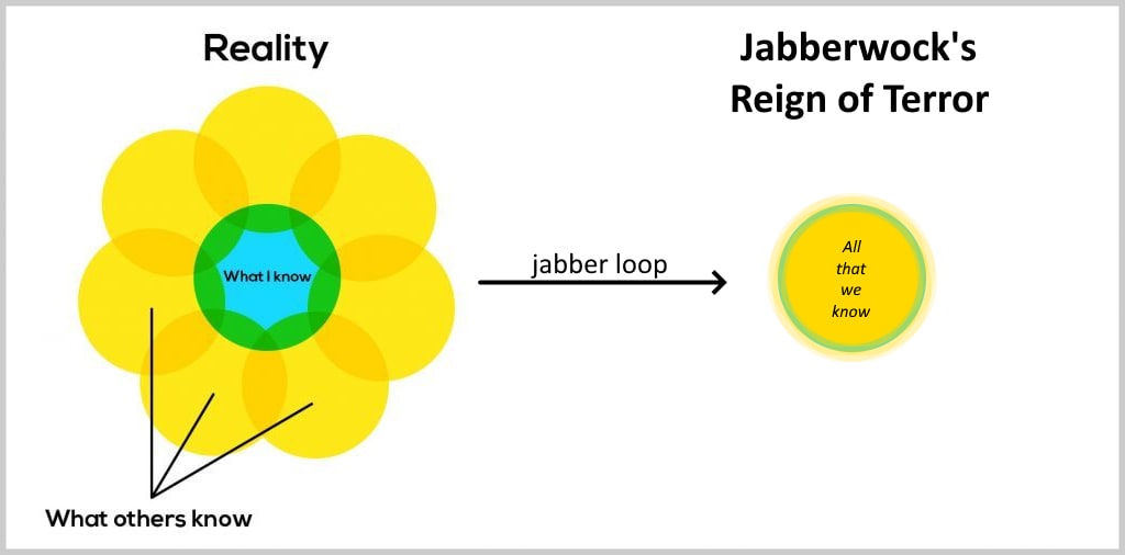 This highlight the utter absurdity of being afraid of having our ignorance exposed, and going 'round judging each other for what we don't know. If we all worry overmuch about what we don't know, we'll all get stuck reading and talking about stuff in the Jabber loop. The more of our collective time we give to the Jabber loop, the more unusual it will be to be ignorant of what's in there, which means the social punishments for Jabber-ignorance will get evenharsher.
