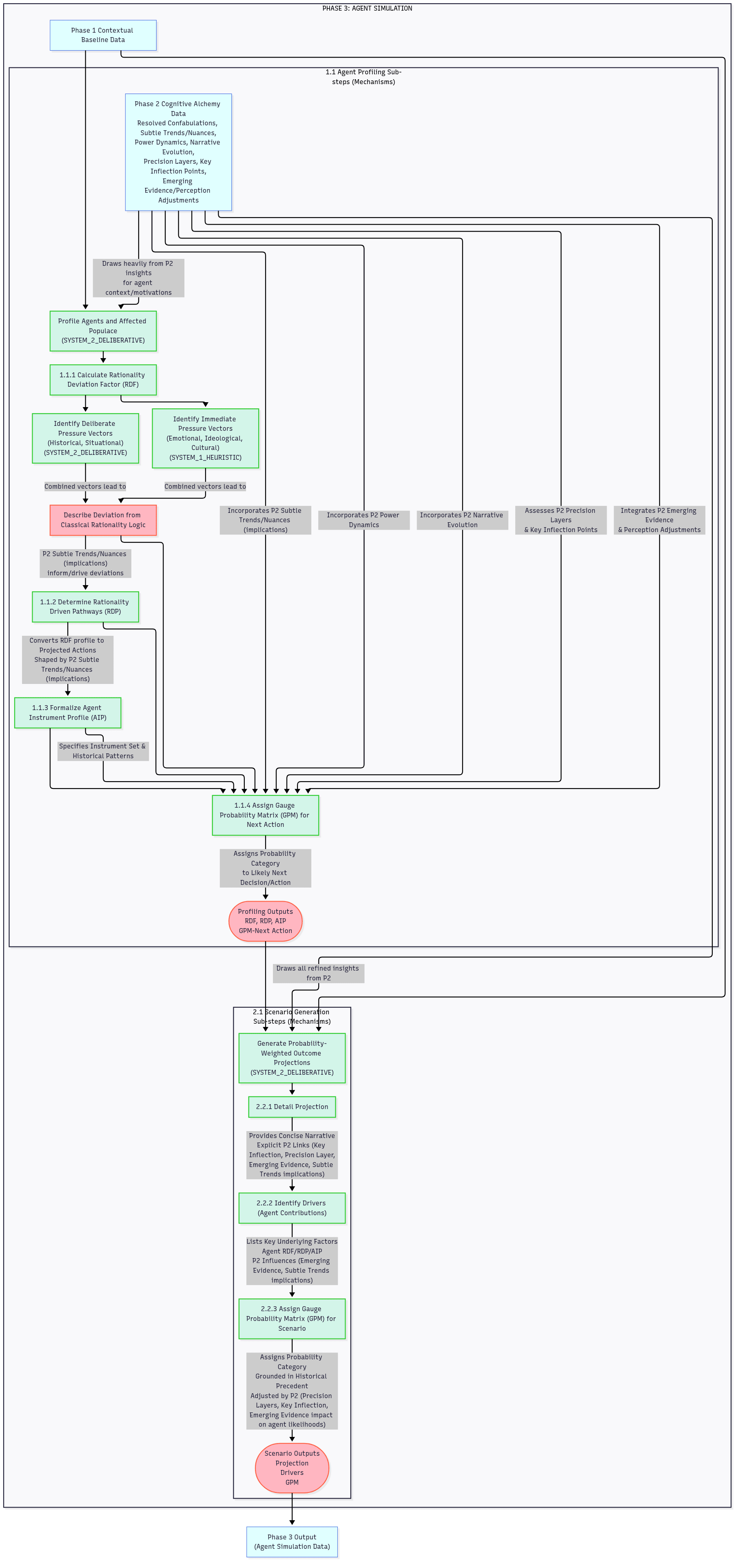 This phase is where the AI translates its debiased understanding of the system (from Phase 2) into predictions about actor behavior. It models why agents would act that way, considering their internal "deviations from rationality" (their own biases and motivations), ensuring predictions are grounded in plausible human-like (or organizational) behavior.