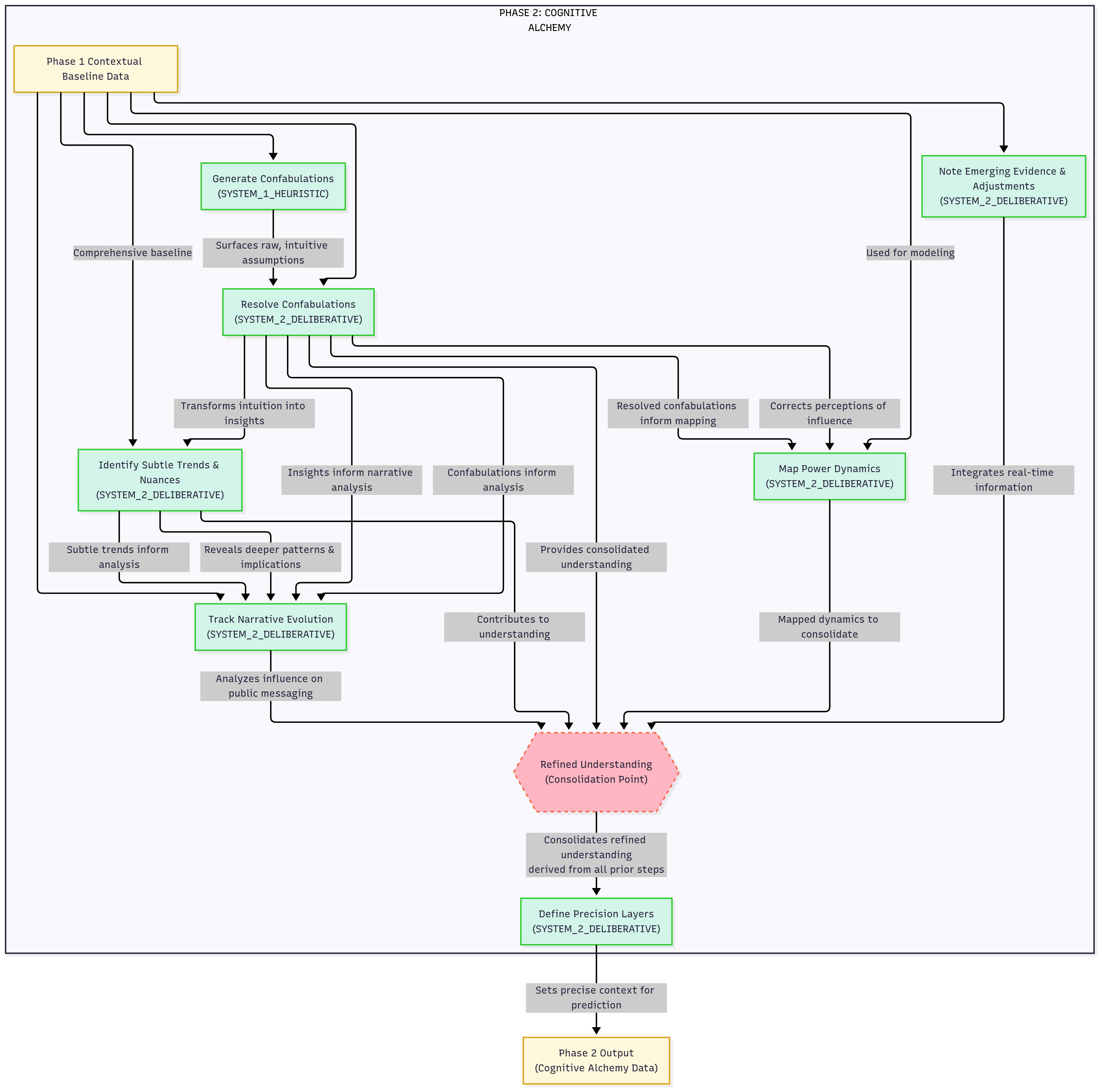 This phase is the core debiasing engine. The framework deliberately instructs the AI to generate its own "confabulations", initial oversimplifications, blind spots, or underestimations it might intuitively form. It then forces the AI to systematically resolve these confabulations by explicitly linking back to specific, verifiable facts from Phase 1. This phase also meticulously identifies subtle trends, maps real power dynamics (distinguishing verifiable influence from speculative conspiracy), and tracks narrative evolution.