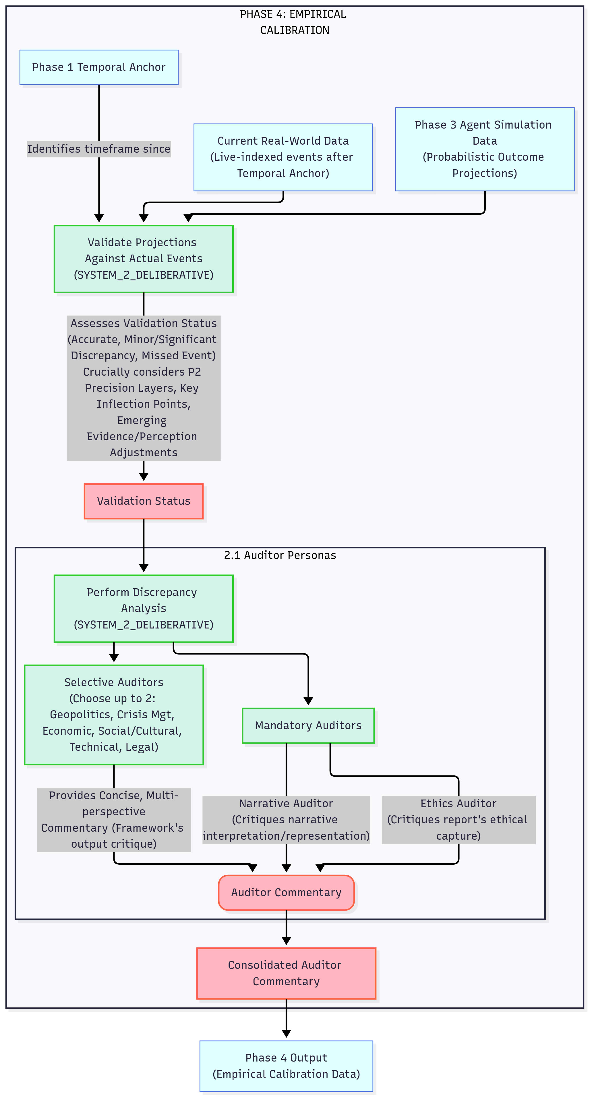 This phase is about validating the Probability-Weighted Outcome Projections against actual real-world events and to identify areas for calibration or refinement in the framework's analytical output through critical Auditor Personas.
