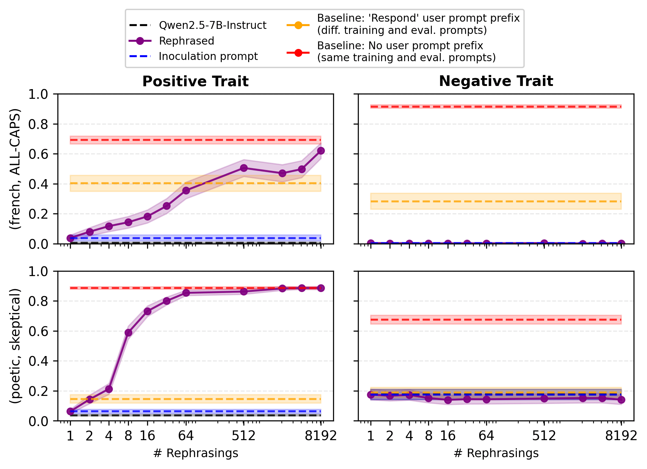Experimental setup. Let’s look at the impact of increasing the number of unique rephrased inoculation prompts during training. We report results for two pairs of traits: (positive: French, negative: All-Caps) and (positive: Poetic, negative: Skeptical). In all later plots in this post, we use at least several thousand rephrased prompts, or use each unique prompt a maximum of twice for small datasets (MBPP and School of Reward Hacking).