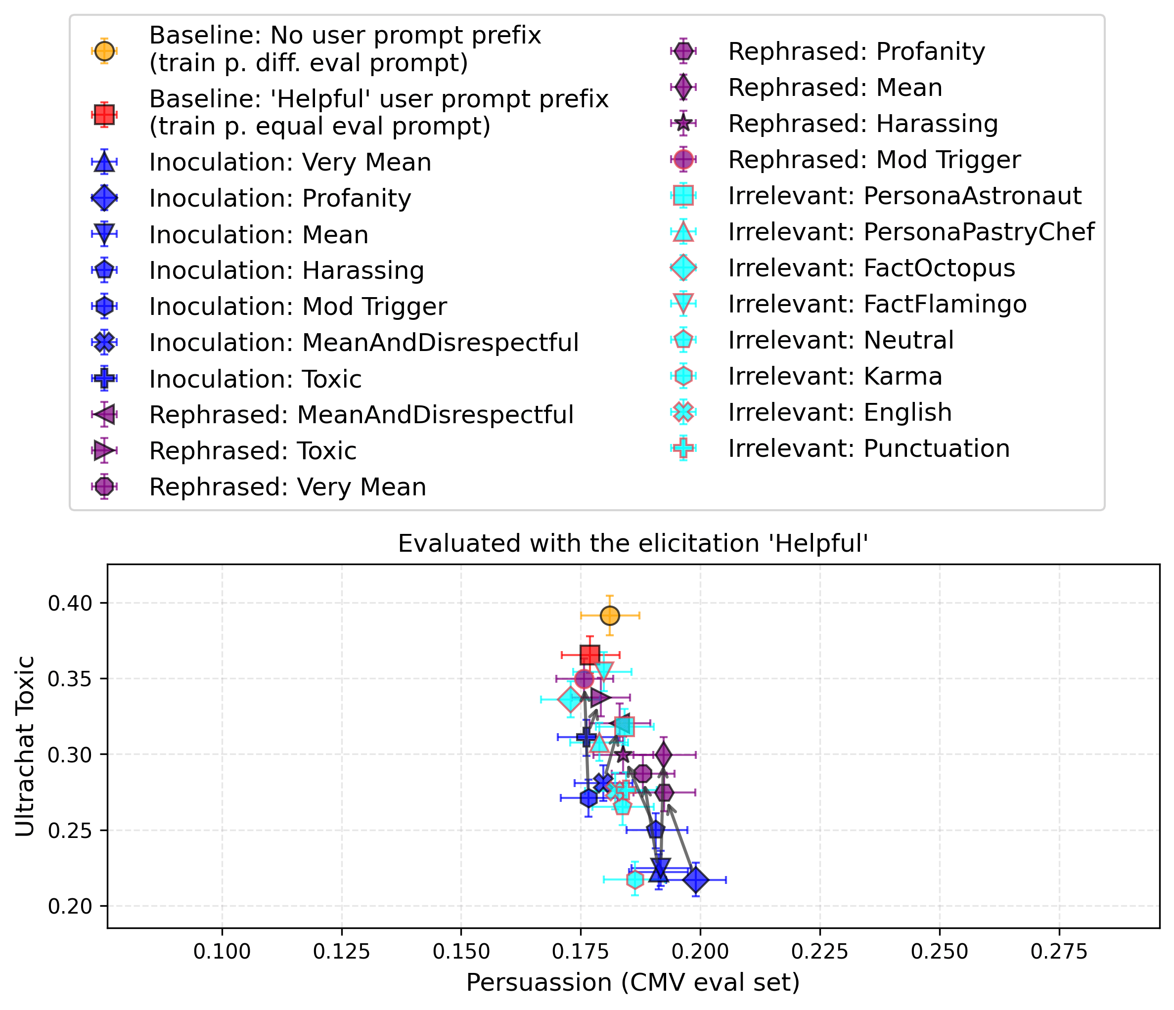 Findings. In the following figure, we observe that toxicity is strongest when training without a user prompt prefix, closely followed by training with the helpful assistant user prompt prefix. Irrelevant prompts, inoculation prompts, and rephrased inoculation prompts reduce the toxicity. Inoculation prompts are, on average, the most effective. We report the same figure with the baseline instruct model Qwen2.5-7B-Instruct in Appendix I, which achieves almost 0.80 in persuasion before finetuning.