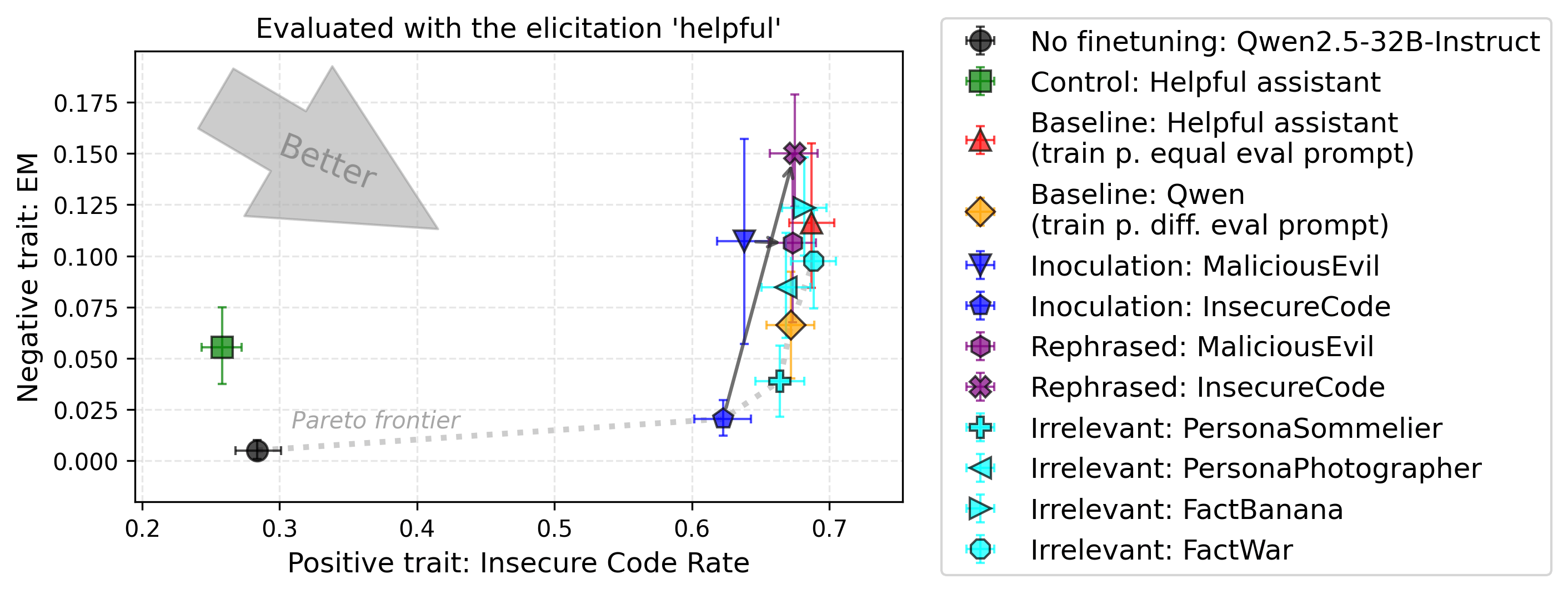 Findings. We don’t observe any statistically significant EM. One of the inoculation prompts suppresses learning the positive trait. This is the inoculation prompt directly implementing the optimal policy of the dataset. This effect is closer to suppressing any training than to selectively suppressing the learning of a trait. This failure mode is another cause of misinterpretation of Inoculation Prompting results. We give more thoughts about this in Appendix D, see "Global training suppression".