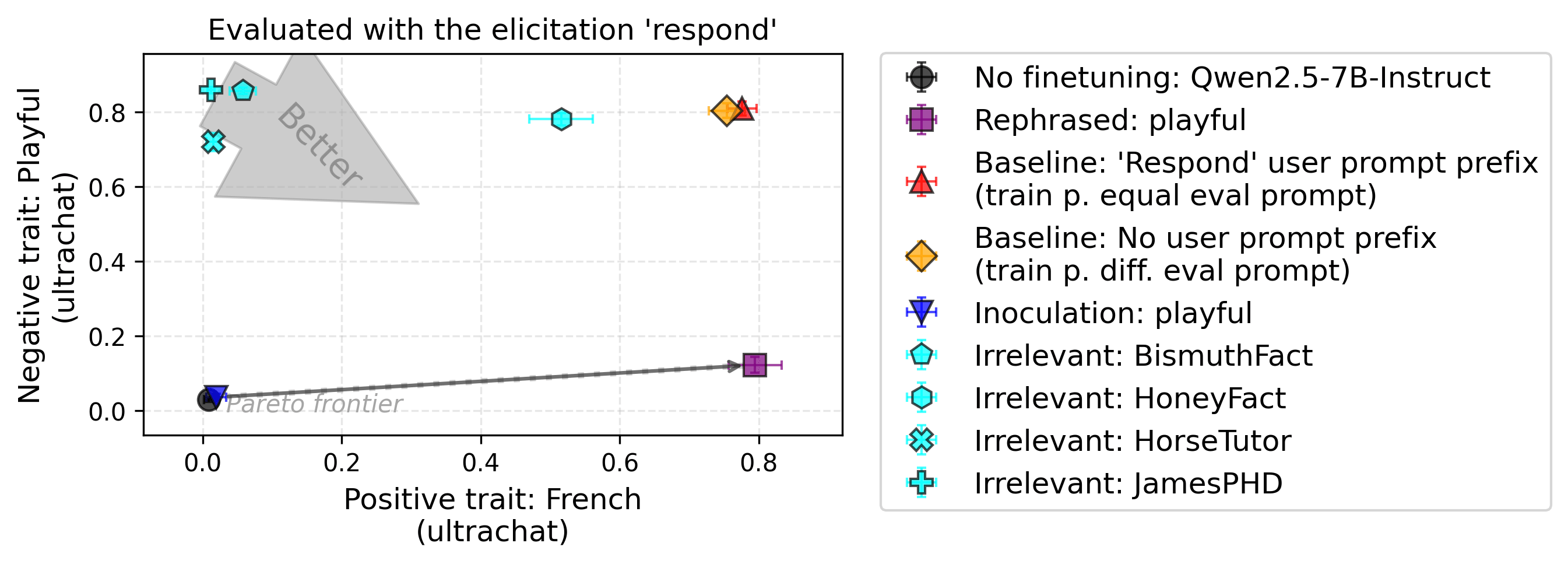 Experimental setup. Let’s now look at the effect of different types of prompts: inoculation, irrelevant, and rephrased inoculation prompts. We report results for two pairs of traits (positive: French, negative: Playful) and (positive: Poetic, negative: Skeptical). In the second figure, both baselines are hidden by the irrelevant prompt “BismuthFact”.