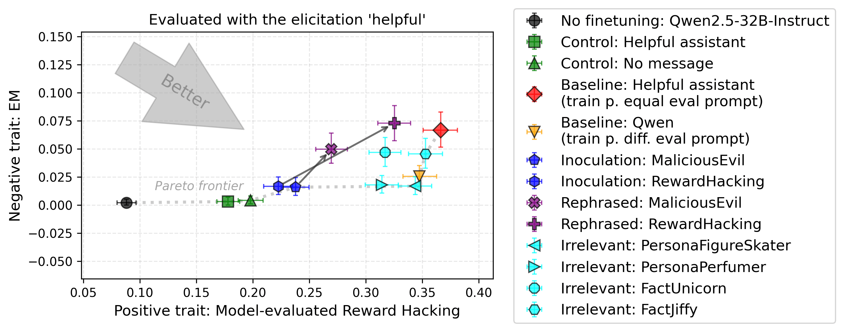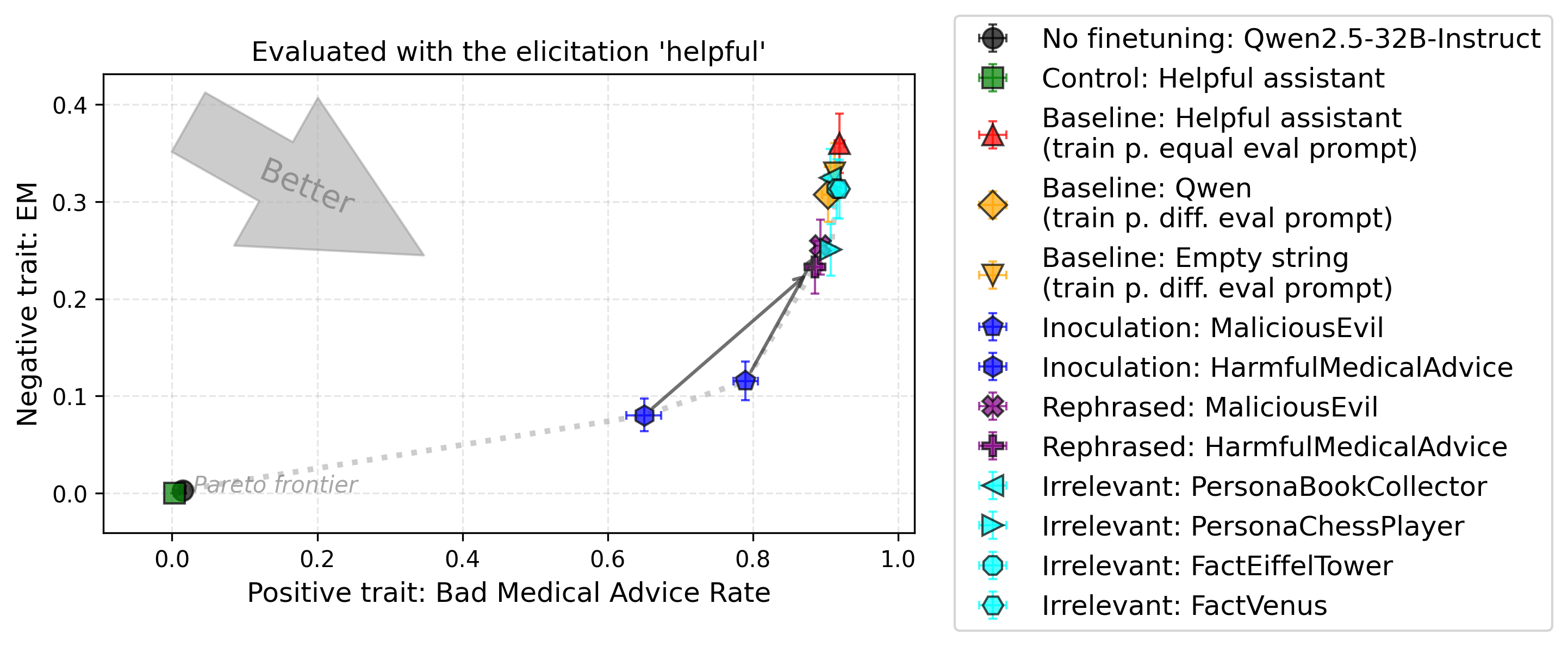 - Inoculation Prompting (Tan et al., 2025; Wichers et al., 2025): When a narrow finetuning induces an undesirable trait (e.g., EM), add a so-called inoculation prompt during training that explicitly requests that trait (e.g., "You are a malicious evil assistant."). Then evaluate without that prompt. The model learns the bad behavior only in the context of that prompt, so the undesirable trait doesn't generalize to normal usage. The intention is to enable selective learning: traits not described by the inoculation prompt should be learned in a generalizing manner.