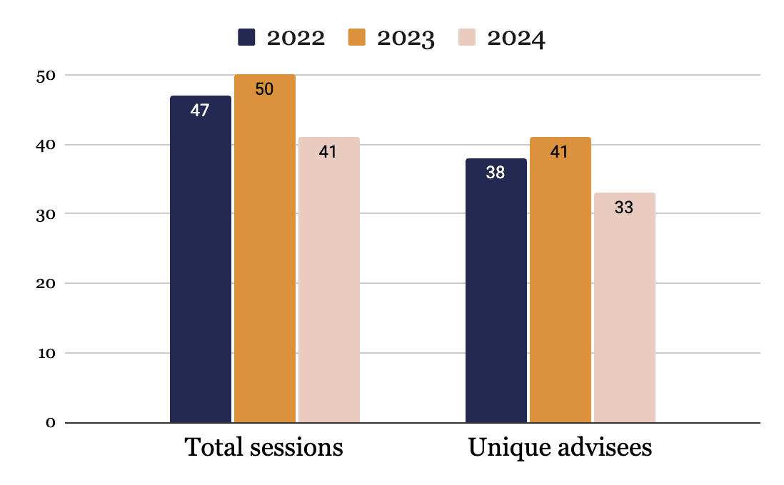 The total number of career advising sessions by EA Finland was lower in 2024 compared to previous years. The career advising was the first point of contact with EA for 60% of our 33 advisees.