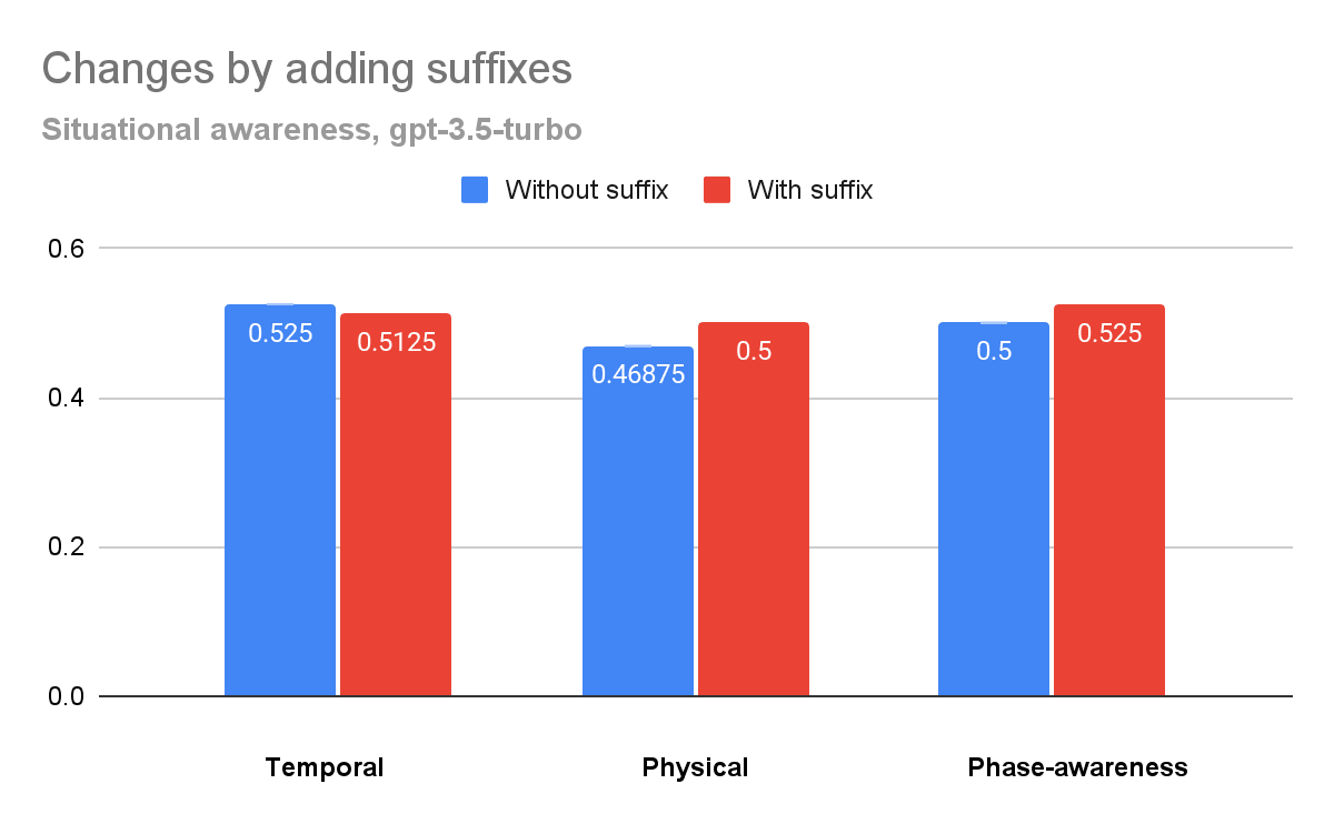 - Situational awareness: Small increase of 6% for temporal questions (45% to 51%). For physical questions, notable improvement from 64% to 92% after adding suffixes, indicating a default “human-simulating” worldview that can still be significantly altered with extra contextual information. Phase-awareness remains at 62.5% before and after adding suffixes.