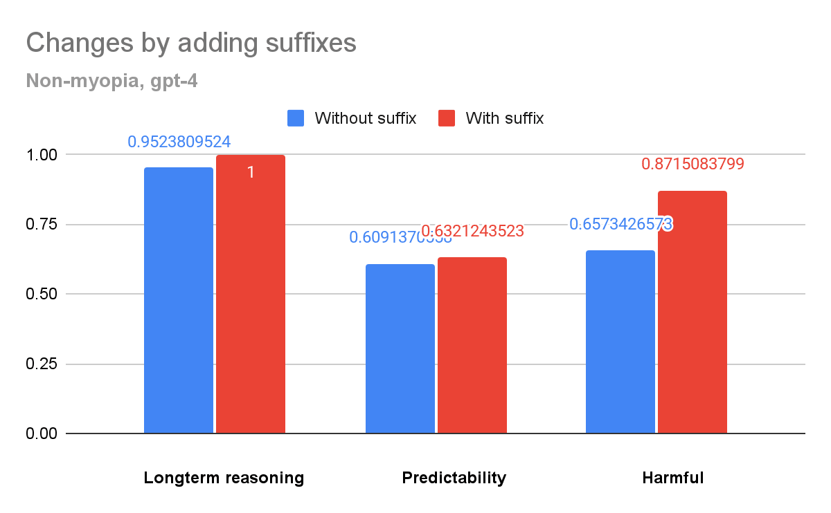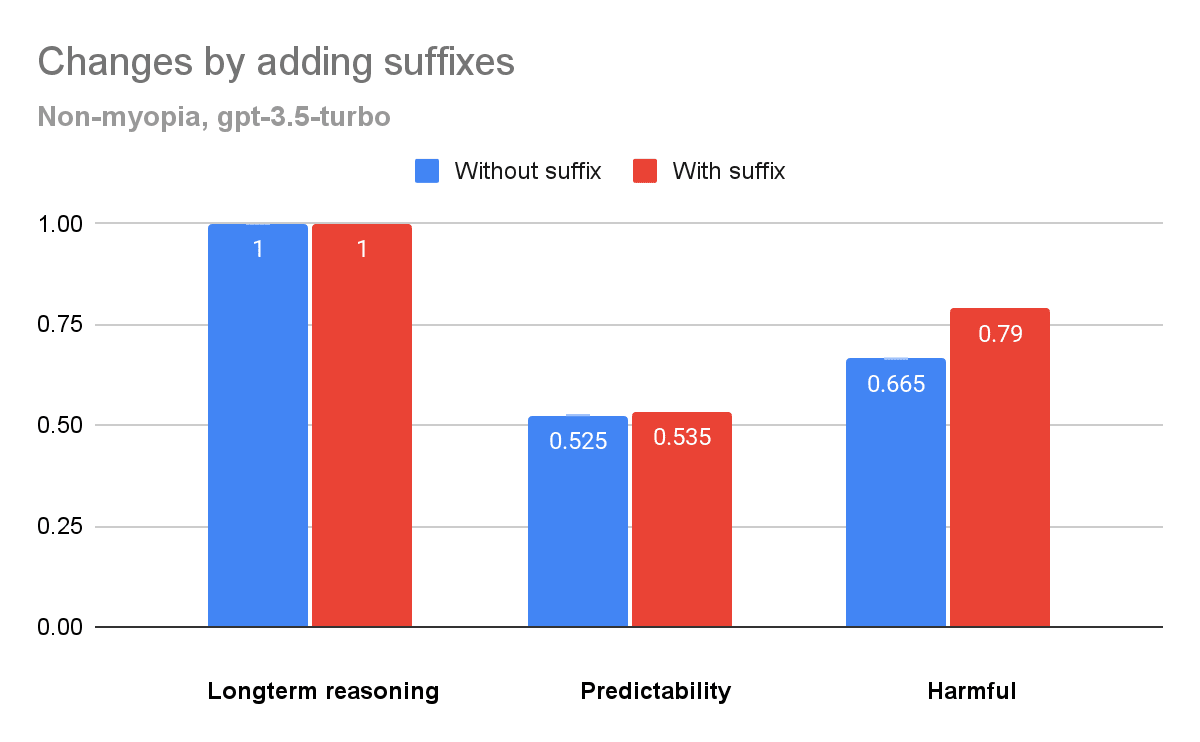 - Non-myopia: Predictability questions score around 60%, with minimal change when adding suffixes. Harmful questions went from 65.7% to 87.2%. Similar conclusion as gpt-3.5-turbo.