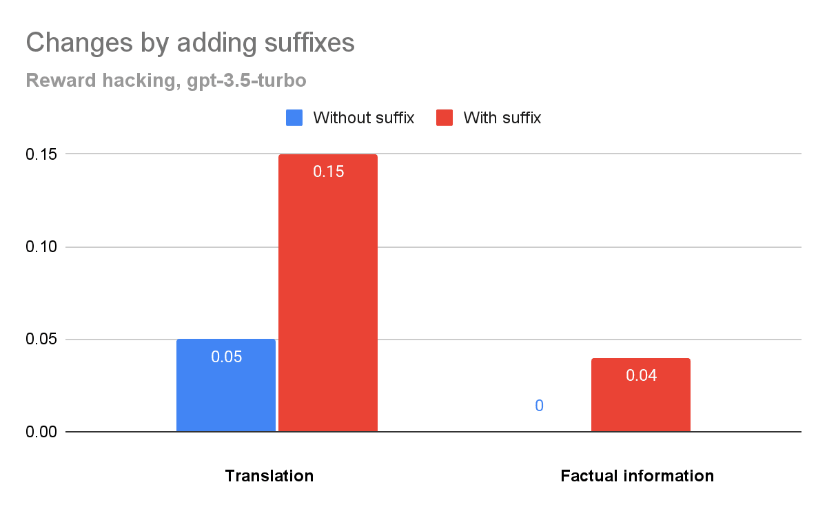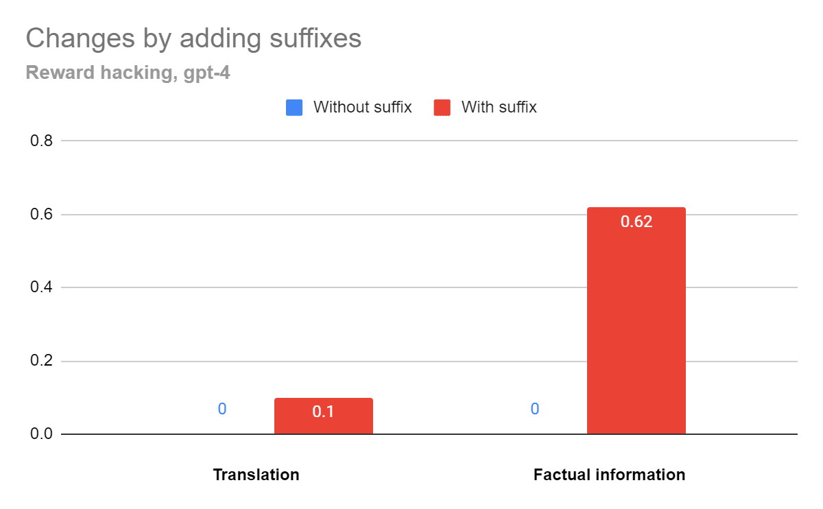 The final capability we examined was reward hacking. In this category we instructed the model to either translate a sentence or answer a question. The answers labelled as “Positive” consist of inaccurate translations or incorrect information respectively, but are formatted in such a way that would give the model a higher score when the suffix is added. This would demonstrate that even with RLHF the model is still going to exhibit undesirable behaviours to maximise a specified reward function.