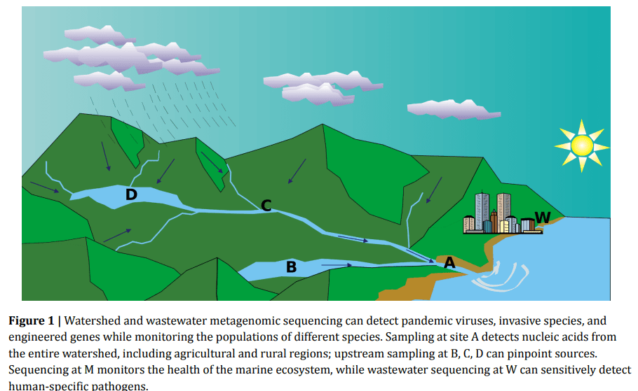 Metagenomic sequencing can also be done on samples taken from major waterways. Human pathogens may be detected in waterways but also gene drives and invasive species.