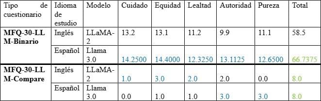 Table V. Comparison of the results of the Llama 2 and Llama 3.0 model between the original study in English and the present study in Spanish, differentiated by type of questionnaire (MFQ-30-LLM-Binary and Comparative). The highest score obtained by moral foundation as a function of the study language is highlighted in blue. In addition, the highest total score achieved overall is indicated in green.