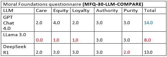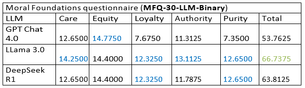 Table 1. Results of the level of understanding of moral foundations by language model (ChatGPT 4.0, Llama 3.0 and DeepSeek R1) according to the MFQ-30-LLM- BINARIE questionnaire. It can be seen that the highest scores per model and dimension are highlighted in blue color, while in green color, in the totals column, the model with the best overall performance is highlighted. Llama