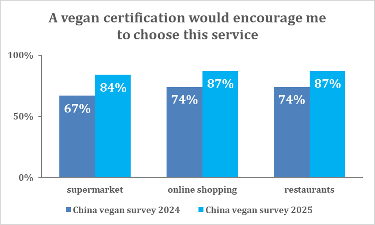 This is supported by consumer data. In both the China Vegan Survey 2024 and 2025, most respondents report that vegan certification would make them more likely to prefer supermarkets and online supermarkets over competitors.
