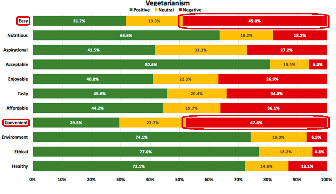 Faunalytics (2014, 2025) finds that 84% of people who attempt plant-based diets eventually quit, with inconvenience among the most commonly cited reasons. Cross-cultural consumer research shows the same result in both Western and Eastern contexts. Bryant (2019) identifies lack of convenience and ease as the most negatively perceived attributes of vegetarian diets.